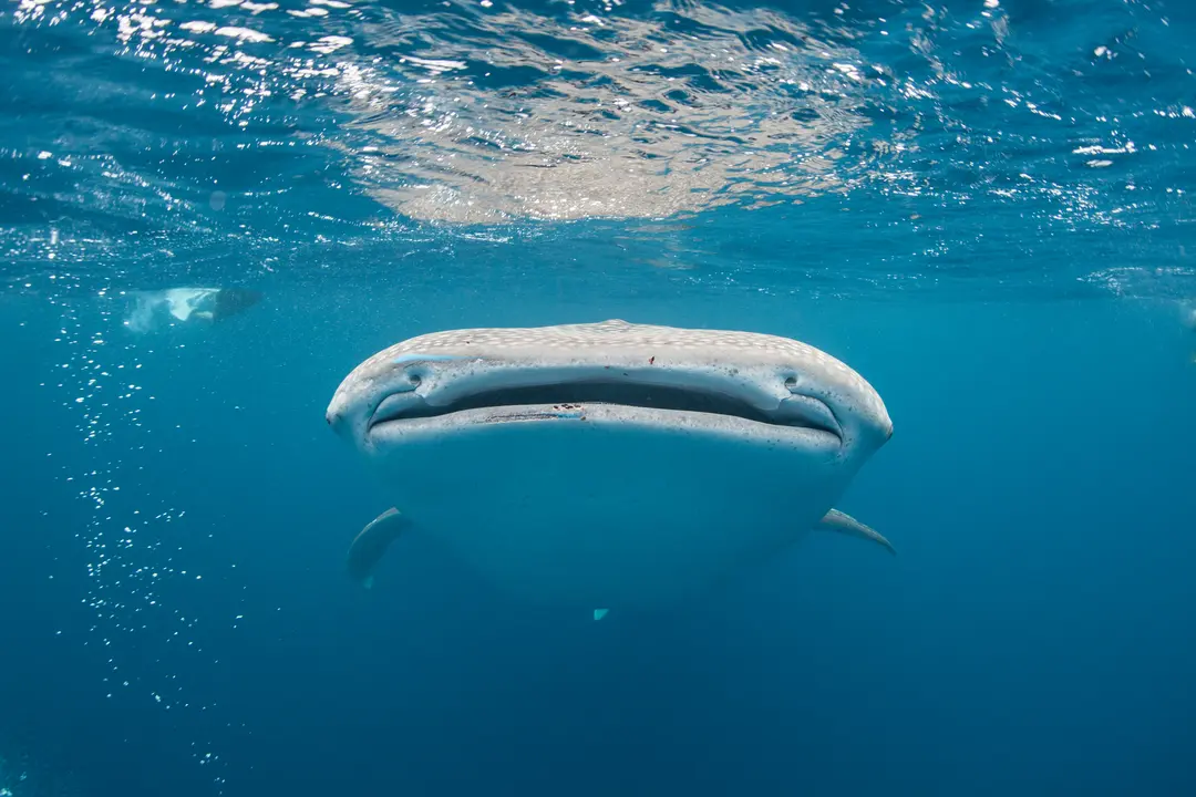 The good thing about this is that although their size is intimidating, whale sharks are non-predatory and rather gentle. They are one of only three known filter-feeding shark species; their mouths able to stretch to four feet wide to process more than 6,000 liters of water an hour using gill rakers as a suction filter for small shrimp, algae, fish, and plankton. That being said, you might want to steer clear of direct contact with their mouths as they not only have 300 rows of tiny teeth but very strong suction power!
